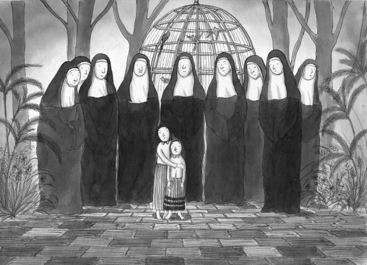 “關上身后粗重的大門,我聞到了一股不同于修道院的氣息,冷冽的風讓我為自己從門后走了出來而感到震驚,然而一切為時已晚。街道很長,平緩的上坡,盡頭處能看到教堂尖塔的一角。邁步走進外面的世界之前,我發覺自己很久之前就不再是小女孩了。街上空無一人,只有兩只瘦狗,一只跟在另外一只屁股后面聞著?!?/p>