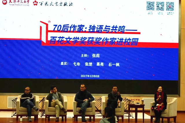 70后作家是一個不事喧嘩的堅實、成熟的群體,成長過程經歷了改革開放前后不同的社會形態,紛繁的變遷與涌動的思潮使他們對于自我和文學的認知都明顯不同于新時期作家和“80后”作家。無論詩歌、散文還是小說創作,70后作家都顯現出一種冷靜而沉郁的氣質,并表現出越來越強烈的時代關懷和現實書寫,積極探索個人敘事與時代精神的融通與契合,向著歷史與人性深處不斷掘進,成為青年作家的中堅力量。2017年12月6日,獲得第十七屆百花文學獎的四位70后作家葛亮、張楚、弋舟、石一楓走進天津師范大學,與在校師生進行了一場主題為“70后作家:獨語與共鳴”的對談,共同研討70后寫作者的精神際遇與美學追求,分享個人寫作歷程。對談由天津師范大學文學院教授張莉主持。