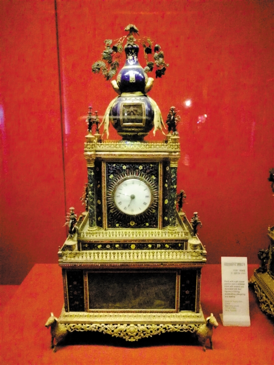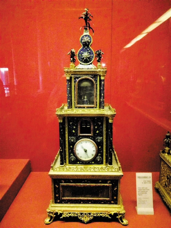 黃慶昌:從現存廣鐘藏品來看,廣州鐘表最為突出的一個特點,是其表面多為色彩鮮艷的各色琺瑯。廣鐘掐絲琺瑯的特點是掐絲生動,釉色鮮艷,其中以寶藍琺瑯貼金片最為突出,最為富麗堂皇。這種貼金銀花的硬透明琺瑯只有廣州能生產,所以稱“廣琺瑯”。