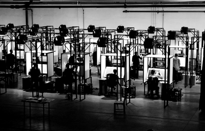 為了解決這些復雜的問題,制作團隊開發了名為PAWS(Painted Animation Work Stations)的工作站系統,它包含了相機、電腦、投影、監視器、光源和畫布等。每位參與的畫師都經過了短期的培訓,有一個開放的相對獨立的小格子間工作站,既可相互交流,又能互不打擾。之前由演員實景拍攝、數字繪景所創建的動畫視頻作為參考物布置在畫布上方,或者投影在畫布上。畫師能夠更加專注于繪畫本身,一幀接一幀地畫下去。重復繪制的數量視很多情況而定,比如鏡頭的運動、人物的數量、運動的形式等,精確地控制每一幀的精度。最后,后期制作人員將油畫師們繪制的油畫通過電腦合成,制作成風格統一的油畫電影。