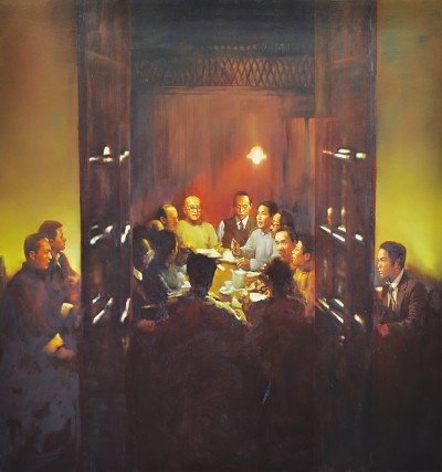 《曙光———中國共產黨的誕生(上海)》中共一大會址紀念館常設展中以中共一大第一次會議為主題創作的油畫(局部)李鵬繪