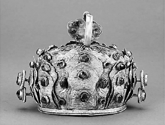 該金鑲紅藍寶石冠高11.5厘米,底徑11厘米,重320克,呈半球形,由形似蓮花瓣的薄金片,內外四層累疊而成。