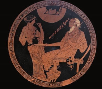 一只阿提卡杯的杯身圖像,展示了赫卡墨得為涅斯托耳調制美酒的場景,約制于公元前490年,意大利Vulci地區