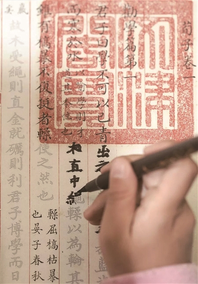 小學生受邀體驗臨摹四庫底本的《荀子·勸學》 攝影/新華社記者 殷剛