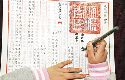 后來由于戰火不斷和保存不善,只有三部原本保存到今天。其中,國圖藏文津閣《四庫全書》是唯一一部原書、原函、原架保存至今的。文津閣《四庫全書》共有36304冊,分裝于6144個木質書函,擺放在128個書架上。它在承德安靜地存放了近130年,后來為了籌備京師圖書館,又從承德運回北京。1915年,當時的京師圖書館終于正式入藏了這部珍寶。之后九十余年中,全書又歷經四次搬遷,終于白石橋總館北區落成之后存于稽古、右文廳。據透露,讀者抄寫內容為文津閣《四庫全書》本:《詩經·關雎》、《論語·學而》和《荀子·勸學》。