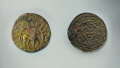 而借助強大的國力和絲綢之路的便利,貴霜王朝也對周邊地區的文化產生了一定的影響。本次展出的漢佉二體錢,是很好的例證。漢佉二體錢分大小兩種,為銅制,并非澆鑄,而是以打壓法制作,大小錢之間的重量比例大致為1:4。這種制造工藝和重量比例說明了漢佉二體錢是一種西方貨幣。然而,錢幣的圖案一面是類似貴霜丘就卻時期銅幣的動物,馬或駱駝;另一面卻標示了古代中國的貨幣單位“銖”,大錢上環繞著漢字“重廿四銖銅錢”,小錢上的漢字“六銖錢”呈品字形分布。這種將兩種貨幣文化特點融于一身的漢佉二體錢,非常生動地體現了貴霜文化對古代喀什、和田地區的影響。