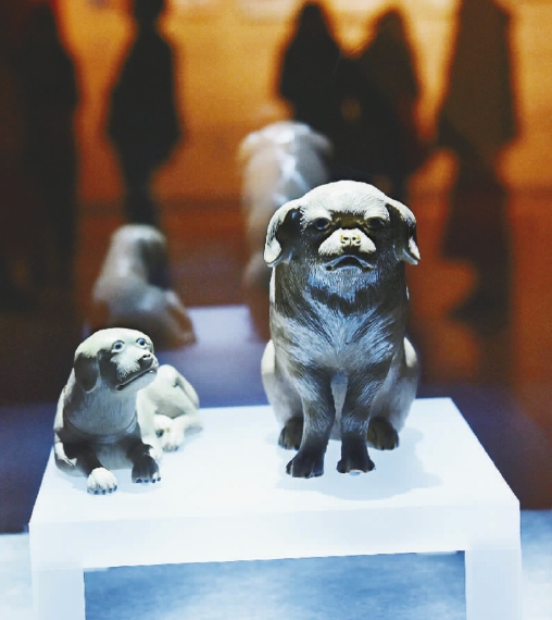 南京博物院為迎接農歷狗年近日舉辦“幸運狗——南京博物院藏犬文物特展” ,展出歷代以狗為題材的各類文物近百件(套) ,介紹傳統狗生肖文化與藝術。圖為清代陶塑狗在展廳展出。