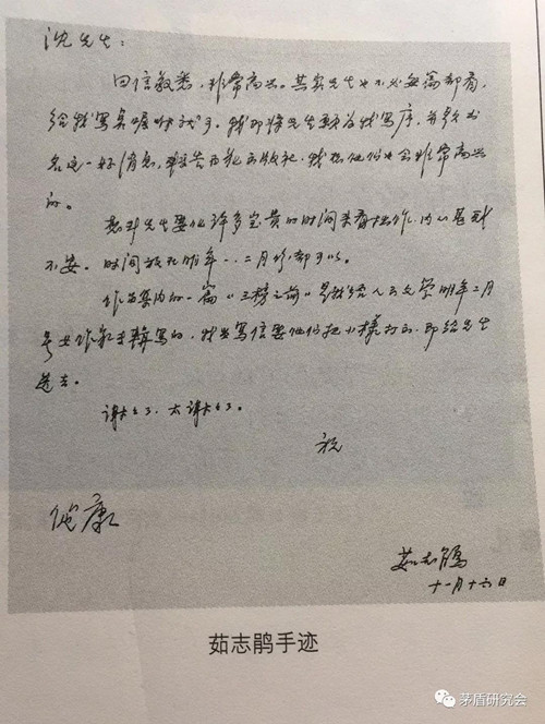 茅盾致茹志鵑(1980年11月9日)