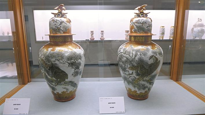 展品中,我注意到有綿野吉二的“金襕手”大瓶和花鳥圖香壺等作品。這個綿野吉二很有商業頭腦,最初,他在石川縣能美郡寺井町制瓷,明治初期看準商機,跑到橫濱開了家九谷瓷器專門店,就叫“綿野吉二商店”。他是當年將日本九谷燒推向海外市場和海外博覽會的重要推手,而今有故事的“綿野吉二商店”瓷器,已成為收藏界的重要藏品了。