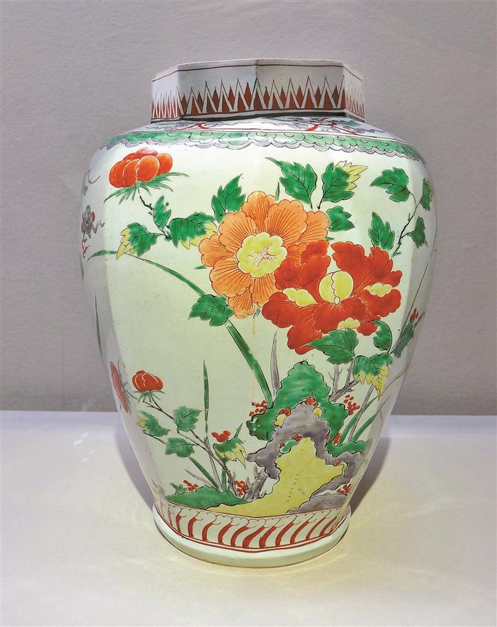 五彩牡丹椿紋八角瓶,有田燒。江戶時代17世紀后期。