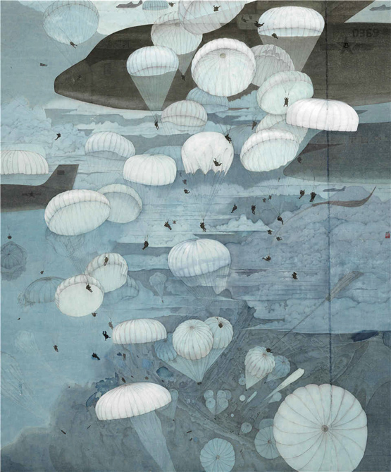 與20世紀八九十年代軍事題材美術創作往往偏向軍旅休閑情景的描寫不同,建軍90周年全國美展中的許多力作如《熱血·青春》《訓練日志》和《整裝待發》等,都以藝術的正面刻畫來直呈軍訓戰士的威武形象,并試圖通過對于硬朗陽剛的軍人形象塑造,揭示這些鋼鐵之師所深蘊的富有血性的民族精神,從而展示了和平年代另一種青年形象的社會人生與人性品質。還有許多作品如湯婷婷《待發》、張蕊《中國琨行動》和呂宛宣《南沙天門》等,描寫了高科技軍事裝備下的現代軍訓場面,這些現代化裝備的表現促使了藝術語言的現代性探索,甚至于這些現代化裝備與現代軍訓生活成為軍事題材美術創作進行藝術語言變革與藝術觀念突破的載體。
