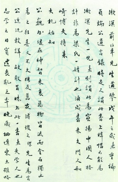 束冥先生惠鑒:手示敬悉,自退直歸,籀讀著論一過,立誼審諦,罙達理要,欽遲何似。承仕學術亡似,辨智不周,雖嘗獲事大師,得聞勝誼,間亦涉獵佛乘,樂觀慈氏世親之書,迫于人事,未嘗為深沉之思,疑殆尚多,卒未窺其究竟,又于大秦驢唇之文素所不習,遠西哲人所說,未能諷籀,無以和會東西,校其□劣。(1910年代)