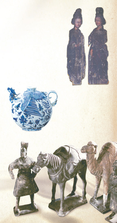 上圖:新會木美人,明代。兩個穿著中式服飾的西洋美人。 廣東新會博物館供圖 中圖:景德鎮窯青花鳳首扁壺,元代。所繪圖案為一只鳳凰昂首奮飛,在意大利服飾和繪畫中也有大量中式鳳凰圖案。 首都博物館供圖 下圖:陶俑,元代。絲綢之路上的一支商旅隊伍。 內蒙古博物院供圖