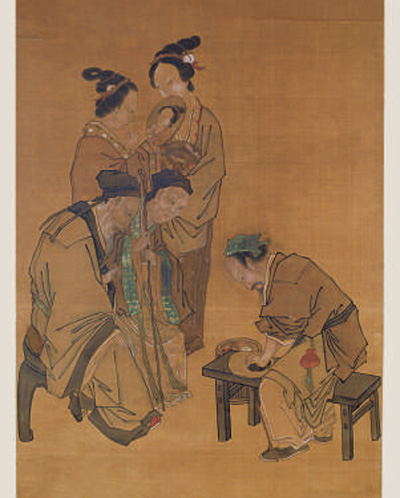 除了歷史文獻記述與磨鏡相關的史料之外,目前還能夠見到一些明清時期畫家繪制的《磨鏡圖》,為今人了解和認識這個古老的職業,提供了清晰的圖像資料。中國國家博物館收藏有一幅清代《磨鏡圖》,畫面上共計五人,左側四人為顧客,右側一人為磨鏡客。磨鏡老漢坐于木條凳后端,前端放鏡,左腳踩著一條繩子,是為了固定正在磨的銅鏡;雙手握氈團,在鏡面上摩擦。條凳內側放置一個圓筒,頂部可見裝有磨鏡藥的罐、瓶等器皿。畫面左側四人,坐者與立者各有兩人。前坐一老翁、一老婦,神情專注地看著磨鏡。后立兩少婦,一位攬鏡自照,鏡中容貌自見;另一位懷抱一面大銅鏡,望著照鏡女子。