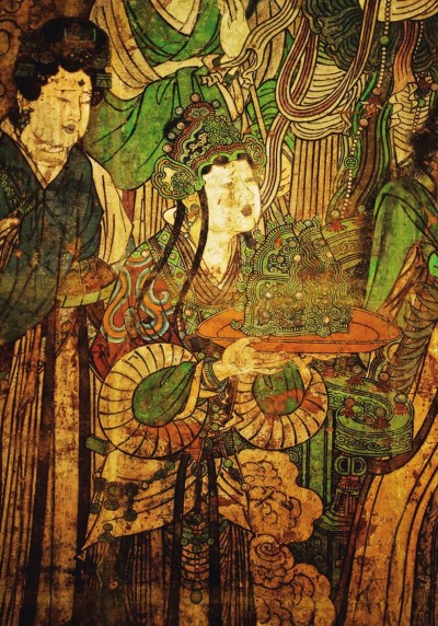 壁畫是人的精神世界的“物化”形態,圖式亦不過是以情為橋,將作畫者對于生命精神的感知,絲絲入扣地輸送給后世的人們;他們仿佛把熱氣騰騰的情感植入一面面冰冷的墻土中,令其有了血肉、呼吸、脈動以及蓬勃的生氣,以至于哪怕千年之后,賞畫者的心也能穿透厚厚的墻壁以及歷史煙云,與作畫者對話、交織與共鳴。壁畫要呈現的,“不僅是畫,而應是一切”,畫里的時空的綿延或頓挫,無不意蘊著畫工的心智和情感,這導致畫中的內容由具體的物象,發展到所思所想,最終升華為一種精神的抽象。壁畫總是用“符號”構建、編碼著不同于創作者生活的世界——符號世界,這種“符號”又最終架構出嚴肅、莊重、神秘、歡快等“意義”,比如,宗教畫以佛的宏大與包容、俗界的色相之美感化眾生,使其獲得審美滿足時,心靈也得以升華。符號也好,色彩也罷,一切元素都在死的畫面中活過來,隱露出神秘又崇高的精神意味。由于抽象、晦澀的經典義理被形象化,加之洞窟的朦朧光線和搖曳燈光也參與到這場“造境”的運動中,信眾于半虛半實的幻覺里,感受佛法的莊嚴、神圣和溫馨。到了當下,藝術脫離宗教,獲得更加自由和廣闊的空間,想像力終究從神性、法性、天堂、凈土的云煙中,恢復原本所依據的人性、社會性、時代性、物質性,現代人最高的心靈需要得到充分的滿足。
