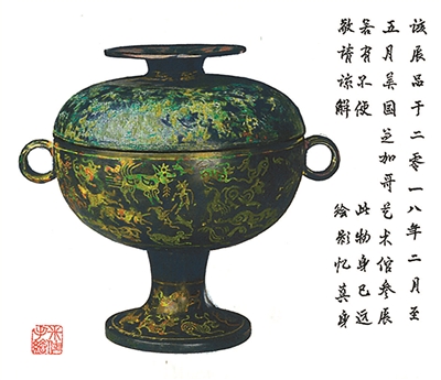 據了解,用繪畫作品代替外出參展的國寶文物,在故宮還是第一次,以往只是在空空的展柜里立個牌子說明,現在的做法顯然更人性化。令人驚異的是,這些畫的作者并非畫家,而是故宮博物院研究員、古器物部金石組組長、著名的青銅研究鑒定專家李米佳先生?!皠e人在故宮修文物,我是在故宮畫文物?!崩蠲准研ρ?。