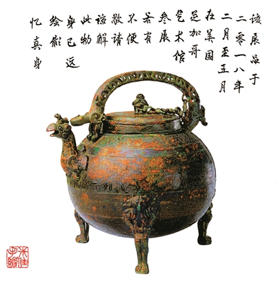 “讓遠道而來的觀眾看一個空柜子,實在說不過去,我靈機一動就想出了這個畫畫的法子,起碼讓人知道國寶長啥樣?!睆纳倌陼r代就開始學習繪畫的李米佳笑著說明了他“畫文物”的初衷。今年2月,青銅器館的5件國寶級文物到美國芝加哥藝術館參展,于是,李米佳決定為它們畫像,以慰藉觀眾的失望之情。