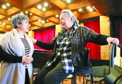 “我剛認識她的時候,她還是小姑娘呢,我那時說她都不是早上八九點鐘的太陽,是七八點鐘的太陽”,鄭小瑛說著,給了章紅艷一個擁抱,“現在她都已經成了這么杰出的藝術家,為普及經典音樂和傳統文化也做出了這么多努力?!闭劦角耙惶炫c迪里拜爾的排練,鄭小瑛同樣贊不絕口:“迪里拜爾也快60歲了,還能唱到這樣的音高、音色,太了不起了!雖然年歲不小了,但這聲音還是我幾十年前可愛的小夜鶯??!”盡管話里話外都難逃“歲月無情”的感慨,鄭小瑛卻一點都不服老。離開排練廳時,坐在車上的她顯得有點“不情愿”:“我也想自己開車,真嫉妒你們這些能開車的年輕人?!?/p>