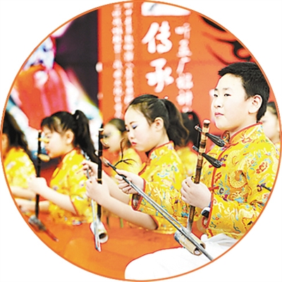 數十位小學生的京胡合奏拉開了展示的序幕。這些孩子側著腦袋,表情凝重,看架勢,如同老琴師的相仿。一抖琴弓子,引來陣陣掌聲?!靶〖一?,真專業?!币晃焕蠋煵唤袊@了一句,“這手腕子可夠要勁兒的?!?/p>