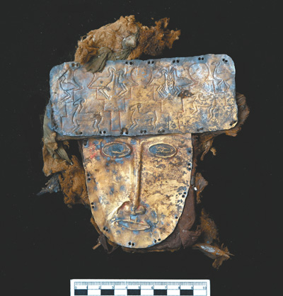 這件面具14厘米見方,薄如紙片,大小與真人面部相仿,由冠部和面部兩部分連綴而成。冠部呈長方形,鏨刻出三座并列的塔形祭壇,頂部有圓形穹頂,與早期佛教時期的窣堵坡非常相似。每個祭壇兩側各刻一只立鶴,祭壇前方各刻一只羊。面部有一部分重疊在冠部之下,重疊部分有兩排小孔,用絲線將兩部分連綴在一起。面部刻出精細的五官,圓目修鼻,甚至表現出人中和法令紋,五官和刻痕都用紅色顏料勾勒,顯得頗有生氣。面具周緣有一周小圓孔,兩個一組,背后襯有多層絲織物,殘留有打結的系帶。絲織物后面又用薄木片加固,通過系帶與絲織物縫制在一起。