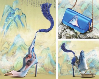 《千里江山》系列緙絲高訂箱包、女鞋。PACC攜手第六代緙絲傳承人王建江與中國原創文化設計鞋履品牌sheme設計師李丹、海派設計師苗海燕共同創作。