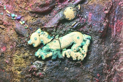 “故郡墓葬的車馬坑最值得一提?!睆埓洪L說,車馬坑在河北省本就罕見,至今發現也不過數座,而要論保存最佳,故郡車馬坑可拔頭籌。五輛車串排的陣列,漆彩貼金的車輿,華美絕倫的絡轡,代表了墓主人的尊貴身份。殉犬帶有項圈銅環,體現了主人對車馬犬的珍視。宏大的規模是墓主人地位、財力和控制力的真實映射?!把橙爽F象和殉牲坑昭示著迥異中原的戎狄風俗?!?/p>