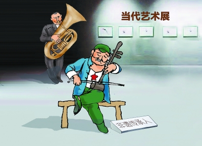 這樣的現象并不鮮見。上周末798藝術區開幕的一場主題為“先鋒與傳統”的展覽,拼湊痕跡就頗明顯。展廳一半空間是離開文字說明便讓人云里霧里的抽象畫,外加幾件多媒體形式呈現的聲光秀;另一半區域更像一鍋“非遺”大雜燴——京劇臉譜、面人兒、活字印刷術,無奇不有?!叭绱撕唵瘟_列就想讓人們讀出個中深意,無異于自欺欺人?!瘪R維建議參觀者遇到類似場景就直接逃離。