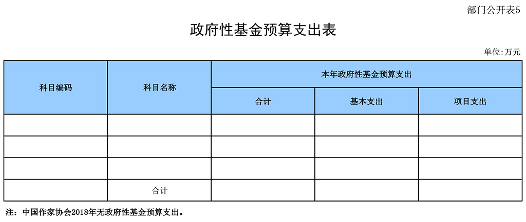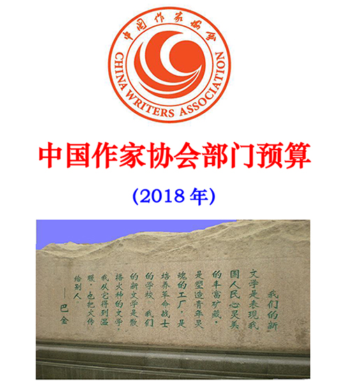 中國作家協會2018年財政撥款收支總預算26572.90萬元。收入全部為一般公共預算撥款,無政府性基金預算撥款,包括:一般公共預算撥款21124.90萬元,上年結轉 5448萬元。支出包括:文化體育與傳媒支出24597.73萬元,社會保障和就業支出1177.17萬元,住房保障支出798萬元。