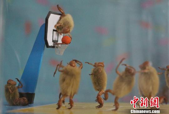 濟南市毛猴非遺傳承人楊鳳巖塑造毛猴“七十二變”的形態,圖為楊鳳巖創作的“毛猴打籃球”?!≮w曉 攝