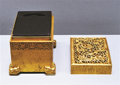 據了解,清宮用硯一般是由內務府造辦處承辦制作,還有少量來自地方官員年例進貢,或由地方織造按內廷發樣承做。在硯的制作工藝上,清代宮廷御用硯不僅精于造型設計,而且還注重裝飾工藝和題材,在造型、紋飾、雕刻等方面多有創新。一般是由內廷如意館畫師畫樣,或遵照皇帝的旨意照硯樣成作。特別是康熙、雍正、乾隆三朝皇帝均參與過硯的設計,而且各有所長。如雍正皇帝曾參與暖硯的設計,并對暖硯進行兩方面創新:一是命作銅爐式暖硯,并稱“硯即可熱,爐也可燒香”;二是新創用水屜溫硯的形式。此兩種形式的暖硯均有實物傳世,在此次展覽中也有展示。