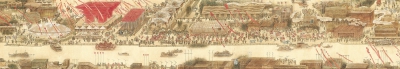 八年前畫院17位青年畫家為上海世博會集體創作的長卷 《萬國風采耀浦江》,出現在此次展覽。這幅畫高0.47米、寬21米,采用的是風俗畫的傳統形式,描繪了浦江兩岸世博園區的萬國建筑與各色游人,創作歷時兩個月完成,刻畫精細。