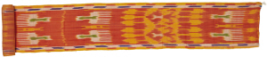 艾德萊斯綢收集于新疆庫爾勒地區,大面積的紅色之中,點綴著象征維吾爾族生存環境的黃色,以及伊斯蘭教崇尚的綠色和象征著天空的藍色。木梳紋、石榴紋、龕座紋等紋樣呈條狀規則排列,多種色彩拼合出強烈的視覺效果,洋溢著跳蕩激昂的韻律和熱情似火的西域風情。
