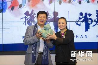 韓美林藝術館館長、韓美林藝術基金會秘書長周建萍將韓美林青銅雕塑《母與子》贈予永新華控股集團主席李永軍