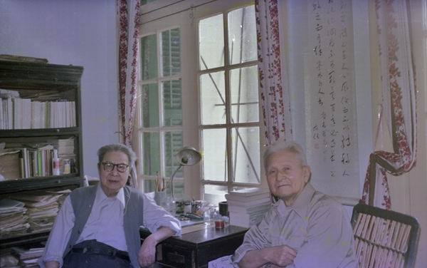 施蟄存(左)與沈仲章(右),上海施寓,1980年代;邵嫣貞攝