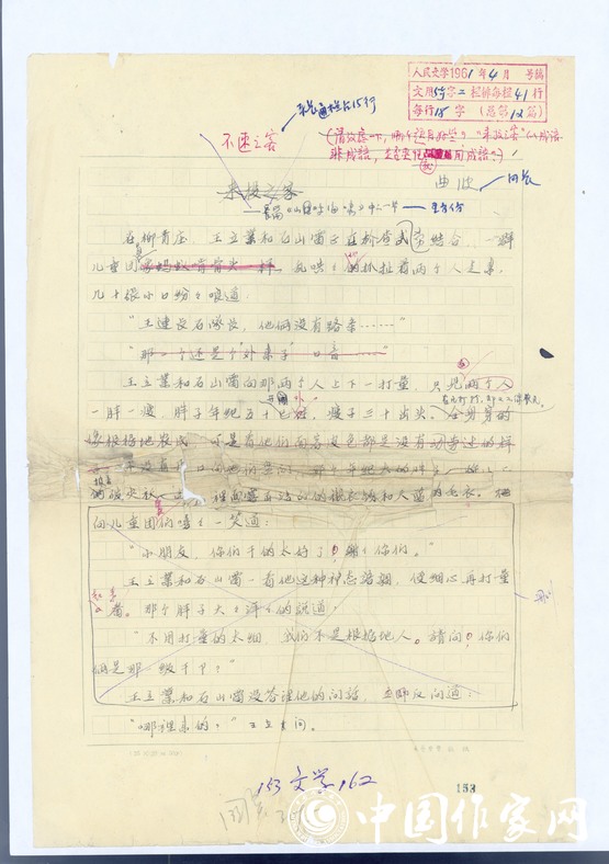 閱讀這份長達39頁的手稿,類似的刪減多達20余處,可見,原稿大量的“枝枝蔓蔓”都被剪掉了。值得注意的是,在校改的過程中,刪減的比例遠大于增加的比例,偶爾可見的增加,也是為了刪掉大段內容之后的“修補”,為了前后連接的順暢,屬于潤滑劑的作用,長段落的內容增加一處都沒有。筆者推測,出現這種情況的原因可能有如下兩種:一是適應版面容量的需要。雜志的容量不像書籍,具有比較大的伸縮性,刊物的頁碼一般都是固定的,在《人民文學》刊發出來的《不速之客》放在了這一期最后的位置,占據了7個頁碼,對原稿進行大量的刪減有可能是為了適應雜志容量的需要。另外,作為長篇小說的一個章節,“手稿版”的敘事更為“松散”一些,不管是對人物神態的細致描述還是在情節上對其他線索的呼應都與一個單獨的短篇小說不同,為了使單獨拿出來的這一章更具可讀性、完整性,刊發本對原稿中與其他線索相連而與本文主要內容聯系并不緊密的部分進行了刪除。也就是說,為了讓這一篇小說更具獨立性和完整性,《人民文學》刊發版對原稿進行了大量刪除。這種校改對于雜志出刊來講當然無可厚非,而且有其必要性。但對原文大量精彩“枝葉”的“修飾”也讓人們失去了閱讀更豐富細節的機會,尤其是在1977年版對手稿進行了“大手術”修改的背景下。