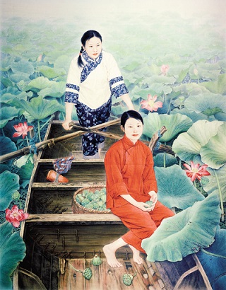 從李乃蔚的作品中可以看出,他的稟賦中具備兩種相輔相成的品格:作畫態度極端認真,求其技術精湛、語言技巧完備和形象真實生動。技巧的精微、細致與否并不關乎繪畫品格的高低,關鍵是作品要有整體感,要有形象的生動性,這便是中國畫論反復強調的不要“謹毛失色” 。繪畫創作不避諱精微、細致的描寫手法,李乃蔚對此有清醒的認識,他不是以顯示自己的寫實技巧為目的,而自覺“力求在傳承的基礎上融入當代的審美情趣,表達自己的所思、所感、所悟,再現時代人物的風貌與情懷、意韻與神采” 。李乃蔚筆下的現實人物與歷史人物,重視人物形象刻畫,在精確的形似中既表現對象外形的美和內在的氣質,同時訴諸自己的主觀感情。寫實藝術最忌對物象純客觀地展示和作者感情的冷漠,而李乃蔚作品中的人物不論是早期的歷史題材《甲申三百年祭》 《黃帝戰蚩尤》 ,以及之后創作的諸多青年女子人像,如《染秋》 《秋語》 《流年》 《生日》 《湘妹子》 《山菊》等,以及描寫陜北民間樂手的《黃土情》 ,都可以感覺到作者對被描寫人物的深刻理解和他的感情傾向。在現實人物肖像中,他尊重對象,從人性的角度揭示他們自身的美感,與他們有內在感情交流。因此,這些人物形象是鮮活的,藝術語言也富于靈韻,與缺乏感情的極端寫實的照相寫實主義作品迥然不同。