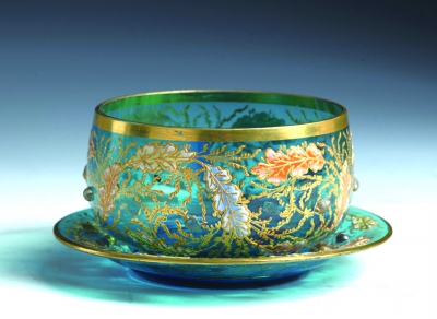展品中,“透明黃色鍍金刻面玻璃畫琺瑯花卉紋瓶”以華麗的鍍金裝飾、絢麗繁復的釉彩繪畫和車刻工藝闡釋了19世紀波西米亞玻璃的精髓;產于20世紀早期的“白套藍鍍金玻璃畫琺瑯花卉紋瓶”,厚重的釉彩加之鍍金工藝使該玻璃器物的表面產生立體浮雕般的效果;“透明套紫車刻鍍金玻璃高腳杯”,在透明玻璃表面套色并進行車刻后,再裝飾鍍金和描金圖案,體現了歐洲玻璃富麗華貴的風格。