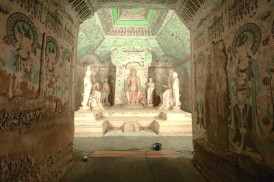 莫高窟第55窟是敦煌石窟代表洞窟之一。它建于宋建隆三年(公元962年)前后,由當時歸義軍節度使曹元忠出資修建。洞窟現存倚坐彌勒佛像三身,菩薩像三身,弟子像一身,另塑力士像兩身,是莫高窟保存最好的一組宋代彩塑,造型衣飾有唐代彩塑的余韻。第55窟面積為585.6平方米,面臨自然損害的風險。