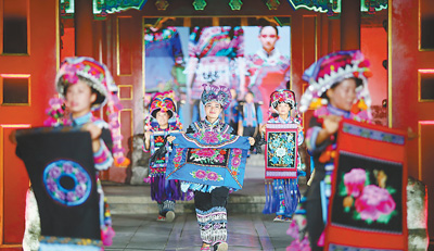 近日,模特在北京恭王府博物館舉辦的“云想彝裳”非遺服飾秀上展示服裝。在2018年文化和自然遺產日到來之際,由恭王府博物館牽頭,聯合中國紡織工業聯合會、北京服裝學院、中央民族大學民族服飾研究所等舉辦11場以中國非物質文化遺產為主題的服飾秀展演、“非遺進景區”群眾體驗性服飾秀等,將多項國家級非遺技藝項目與現代服飾設計時尚融合,將古老的非遺之美與當下結合。