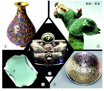 亮相第八屆國際傳統藝術邀請展的作品:①銅雕技藝代表性傳承人朱炳仁作品。②烏克蘭國寶級藝術家奧列格·平丘克作品。③建盞燒制技藝新生代工藝師饒飛雄作品。④龍泉青瓷燒制技藝傳承人李震作品。⑤上海工藝美術學院青年教師謝白設計的首飾。(均上海藝術品博物館供圖)
