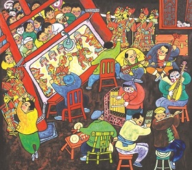 人們在西郊農民畫中能夠讀出上海,是因為它們所依據的個體記憶是非常具體實在的。西郊農民畫的創始人高金龍原是長寧區新涇鎮中新涇村人,他的作品較多聚焦原住鄉村的公共生活,如生產勞作、年節禮俗、社群交往、鄉村風貌等等,連綴起來看幾乎就是西郊的 《清明上河圖》?!镀び啊肥撬?992年的作品,西郊的皮影曾是當地流行的晚間娛樂,村民聚在一起吹拉彈唱,其樂融融,據說中間的紅衣樂手就是他照著自家娘子的樣子創作的。應建中本人不會紡紗織布,她畫 《織娘》是因為忘不了以前母親手搖土布做的衣服和被褥,那些花樣牢牢刻印在了記憶里,成為畫作的背景。她是照著上海閔行一架真的紡車來畫這幅畫的。