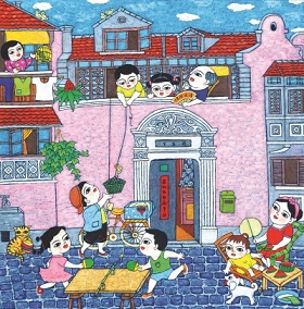 這種依據個人記憶來選題的創作形式被延續了下來,目前西郊農民畫的創作團隊包含不同代際和各種來源,這就保證了它可以在畫面上跟隨西郊城鎮化的進程,同時與時共進地展現方方面面的上海風情。伴隨著搬遷、購房等帶來的人口流動,新涇也和上海的其他城區一樣,有了越來越多的遷入人口。梁瑞芬女士今年72歲,她的 《夏日的回憶》,畫的是上個世紀七八十年代她在石庫門里所見的快樂童年。那個時候流行打乒乓,聽到樓下叫賣光明牌赤豆棒冰,急忙放下籃子夾著鈔票提上棒冰,阿爺在喝茶,阿婆在喂鳥……這樣老城區的市井風情實在是太經典的上海映象。與街坊鄰里的描述對應,李介蕓的 《迎春》是私房人家的年節情形。這幅畫是相當寫實的,從枇杷樹、山茶花到地磚、落地窗,都和家中實景一模一樣。畫者自己和阿公阿婆、丈夫孩子悉數出場,活脫脫一幅畫筆下的全家福。畫 《驚心動魄》的夏智陽只有12歲,對賽車癡迷得很,各種賽道、零件講起來如數家珍。如果不放在西郊農民畫的歷史線索里去觀察,他的這幅作品與普通的兒童畫無異,但這恰恰說明了西郊的城鎮化已經完成了代際跨越。