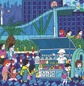 1990年代以前,西郊河浜縱橫,是豐饒的魚米之鄉。目前西郊農民畫的非遺傳承人胡佩群女士原是長寧區新涇鎮馬橋村人,她的代表作大多取材于親身經歷,幾乎每幅作品都有人物原型。她2008年創作的 《金秋紅菱》畫的就是她出生的地方,村里的水塘、江南的菱角、頭巾圍兜、木桶船、生下來就打耳洞的村婦、穿紅衣的勤快的胖媽媽……這是非常私人化的兒時記憶,也是被夯實了的真實存在過的上海西郊。吳巧云2017年畫《早餐》時,在地鐵2號線威寧路、北新涇、淞虹路等多個站點拍照取景。和她自己年輕時候大餅油條的早飯習慣不同,她看到路人行色匆匆,從早餐車上買包子和鮮榨的果汁,與市中心的摩登做派完全一樣;而這幾個地鐵站頭就是曾經的西郊。這兩幅農民畫,可謂上海城鎮化轉型的如實描繪,改革年代里百姓生活的飛速變化,連西郊人自己也是常常感慨不已的。