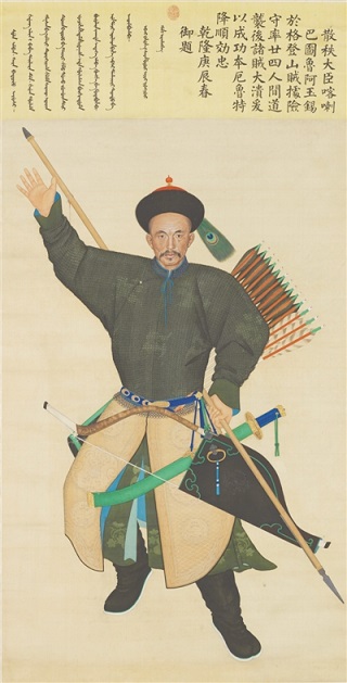 清乾隆年間,為了加強國家的統一,中央政府曾多次派兵平定邊疆叛亂。為了宣揚“十全武功”,每次軍隊凱旋,乾隆皇帝都要下令為征戰中的功臣繪制畫像,并將它們懸掛在中南海紫光閣內,計有280幅,統稱為“紫光閣功臣像”,天津博物館所藏《散秩大臣喀喇巴圖魯阿玉錫像》 即是其中之一。