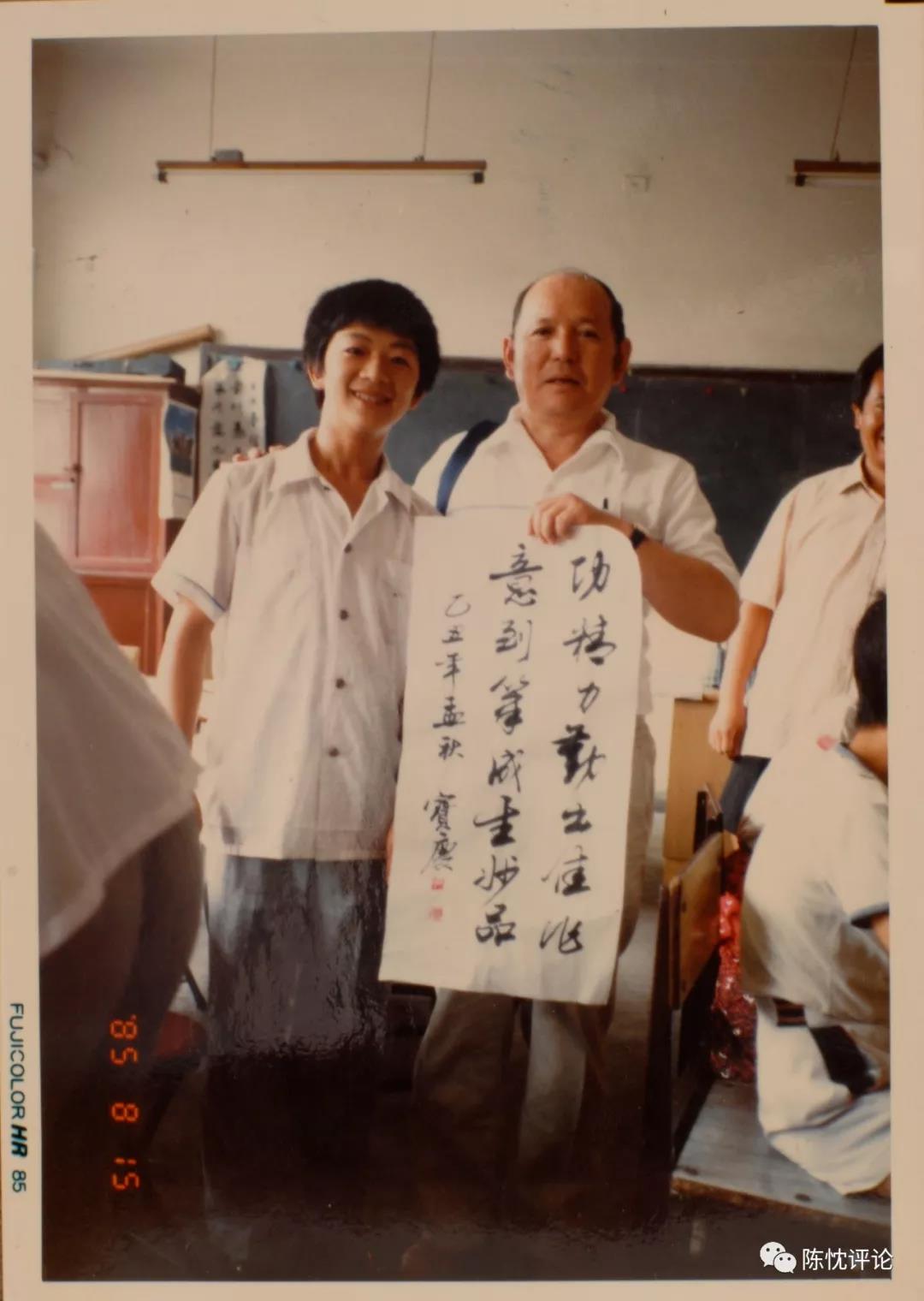 1985年郭寶慶(左)贈送日本早稻田大學友好交流訪問團書法作品