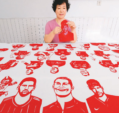 日前,河北省邯鄲市民間剪紙藝人馮石萍利用兩周時間,創作出以梅西、C羅、內馬爾等球星為原型的剪紙作品,迎接世界杯的到來。