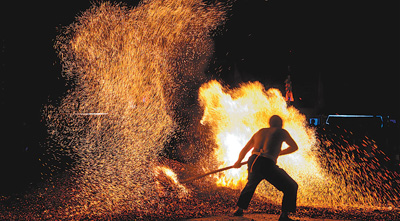 日前,浙江省金華市磐安縣大皿村舉行了一場非遺煉火民俗活動,吸引2000多名游客觀看。煉火是磐安縣獨特的原生態民間藝術,流傳至今已有千年歷史,于2005年被列為省級非物質文化遺產。煉火者赤膊光腳、高歌狂舞、大聲吶喊,同時沖進紅彤彤的火炭堆上奔跑,動作粗獷有力。圖為煉火者在進行表演。