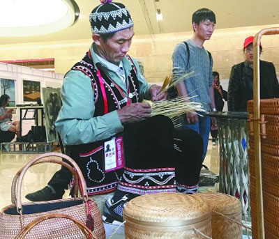 云南瀾滄非遺傳承人李扎而現場展示竹編技藝。張勇攝/光明圖片