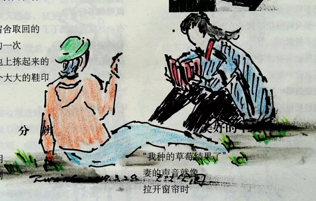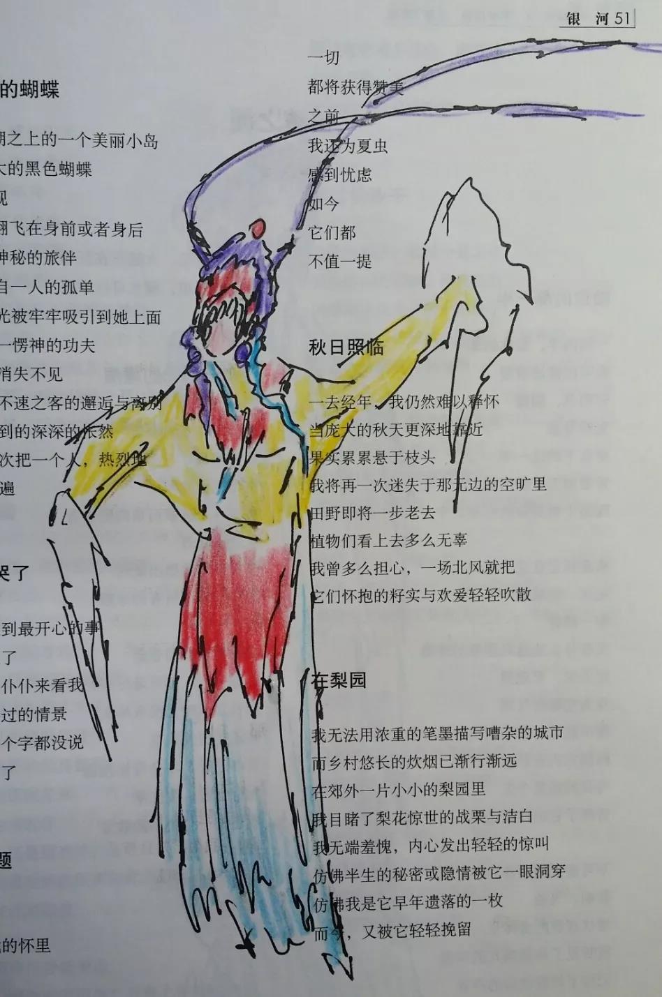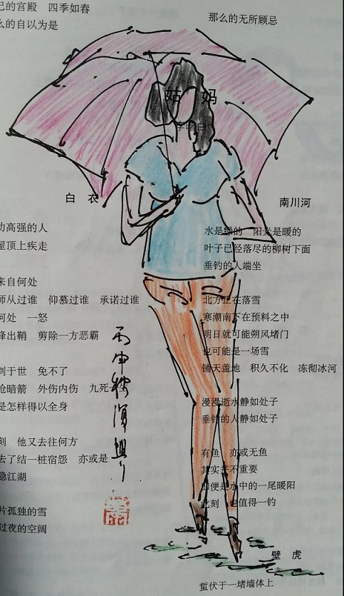 這一發現,給我自得其樂無窮。便回過頭來重新看我在詩刊上畫的畫,居然很多張畫的旁邊或畫里面,都有詩的題目或詩里面的句子,和畫劍鞘相配,仿佛前世的默默姻緣,似乎是埋藏在那里的伏兵,等待著出其不意的襲擊。原來《在梨園》并非孤例。