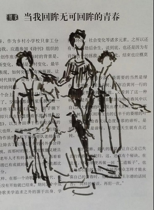 中國文人畫本來就講究題詩和題句,讓畫與詩互文。好的詩文會給畫以象外之意。詩刊上這些詩句和詩題,幫我這些無聊的畫點綴出新鮮一些的生趣。這樣意外的發現,讓我自鳴得意,在詩刊上畫畫的勁頭更多更濃。在我家所有的刊物中,詩刊是被利用得最充分的,也成為我最喜歡隨身攜帶的速寫本。